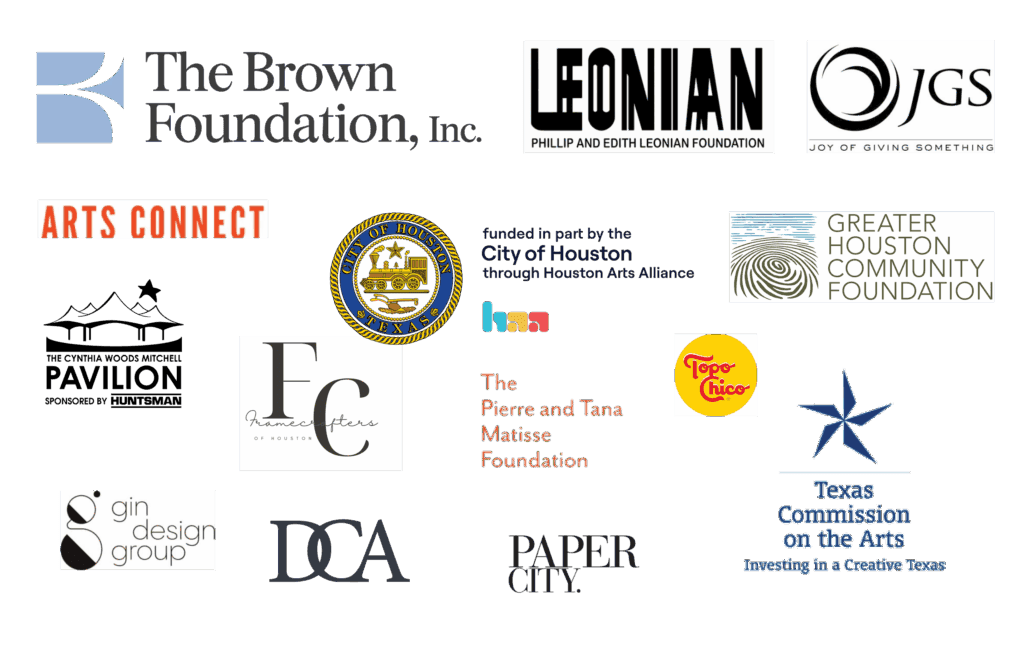 Arts Connect Art Action Fund, Barnes/Coagula Charitable Fund, The Brown Foundation, Charities Aid Foundation America, The Cohn Connor Giving Fund, Continental Societies Inc. Houston Chapter, The Cynthia Woods Mitchell Pavillion, Davis Cohen Art, Dumas Family Fund, Framecrafters, Inc., gin design group, Graham Holdings JK Group, Greater Houston Community Foundation, Houston Arts Alliance, Joshua Hansel Donor Fund, Joy of Giving Something, Paper City, Phillip and Edith Leonian Foundation, Pierre and Tana Matisse Foundation, Robertson Finley Foundation, Saint Arnold Brewing Company, Scott & Therese Griffiths Family Fund, Texas Commission on the Arts, Topo Chico